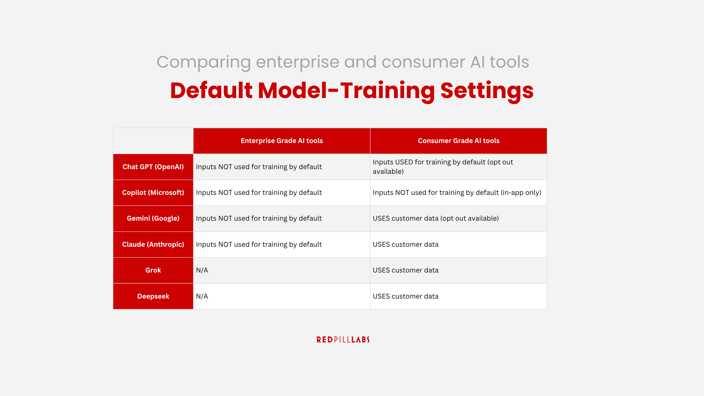 A critical distinction for any organization is how consumer-grade AI tools (e.g., standard ChatGPT, Gemini, etc.) handle user data compared to their enterprise-grade counterparts.